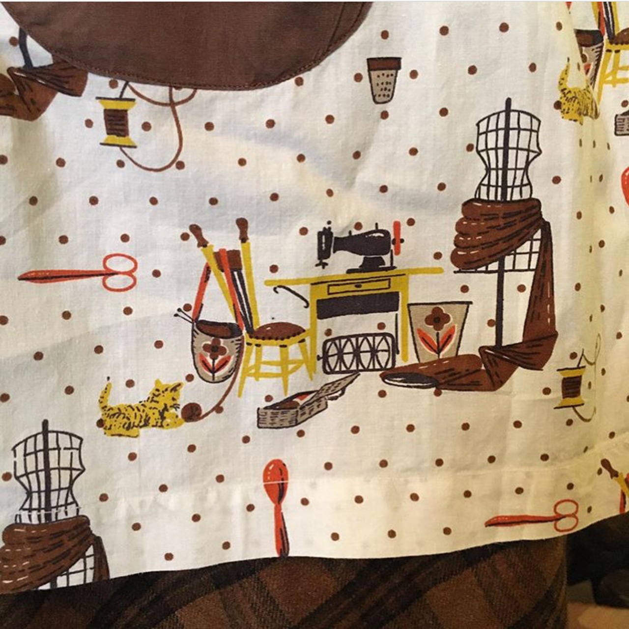 ミシン台やトルソーに構想中のお洋服、毛糸と戯れる猫。裁ち鋏や糸と針、指ぬきなどのモチーフが茶色のドット模様と共に散りばめられ誰かさんのおうちでの可愛い時間が想像できるデザインです。