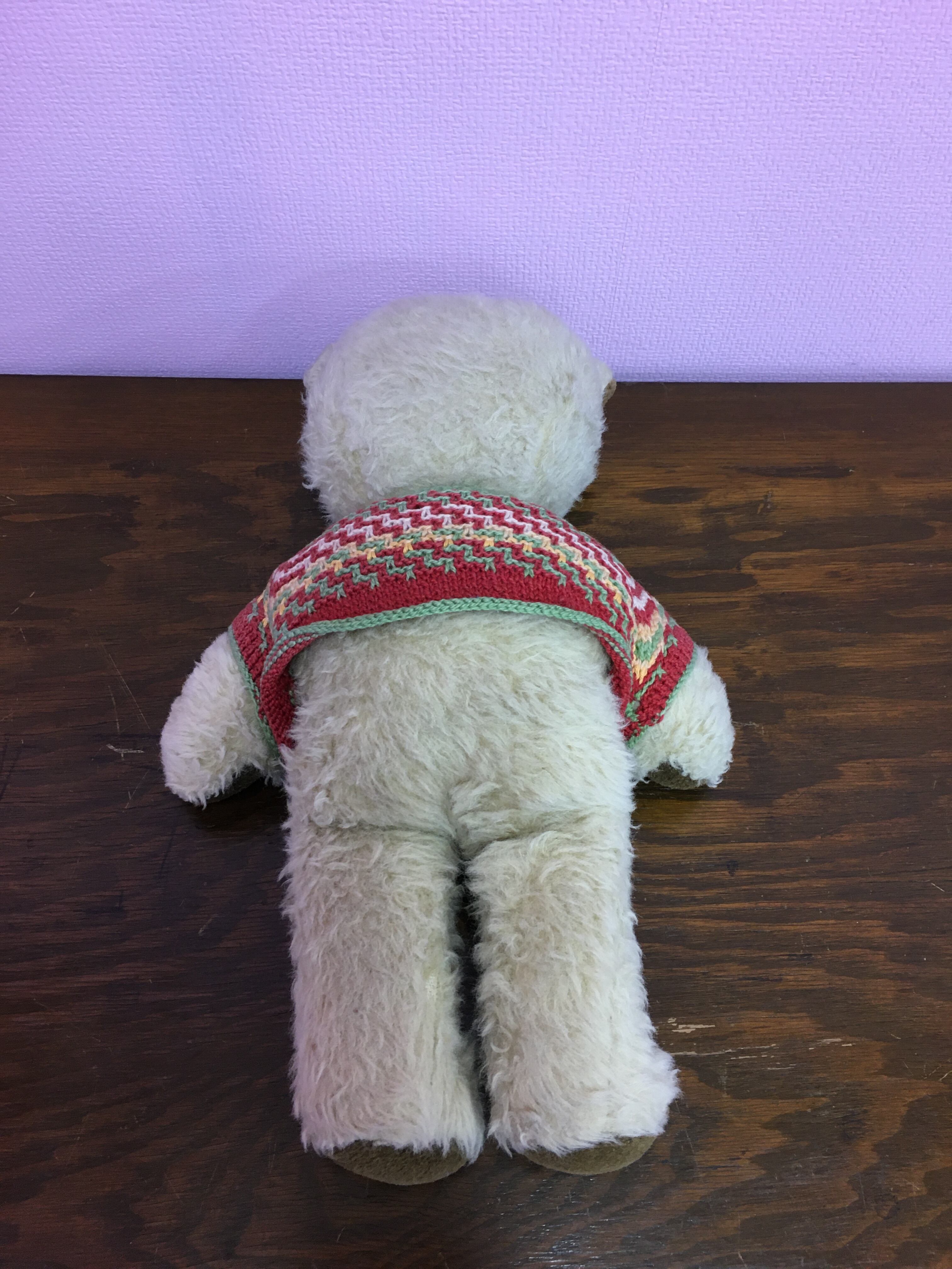 おばあちゃんが編んだようなニットのカーディガンを着たクマさんです。ウクライナより。