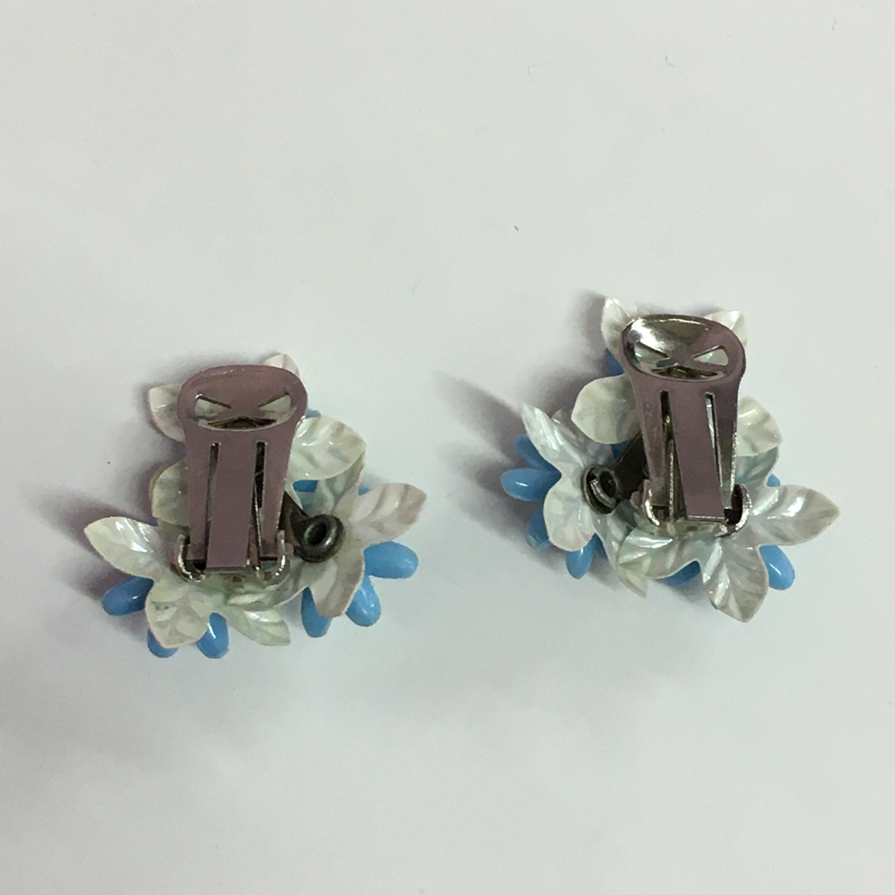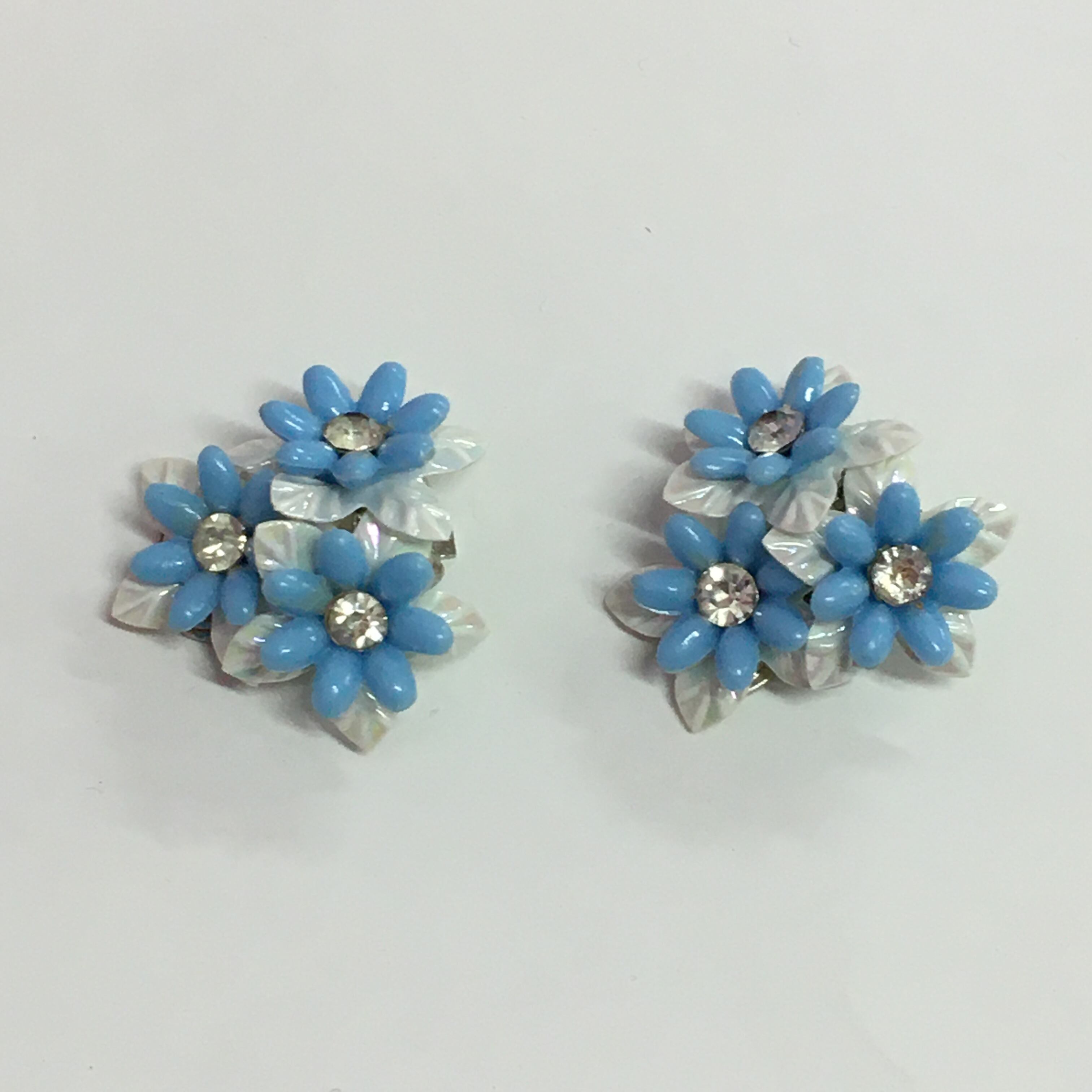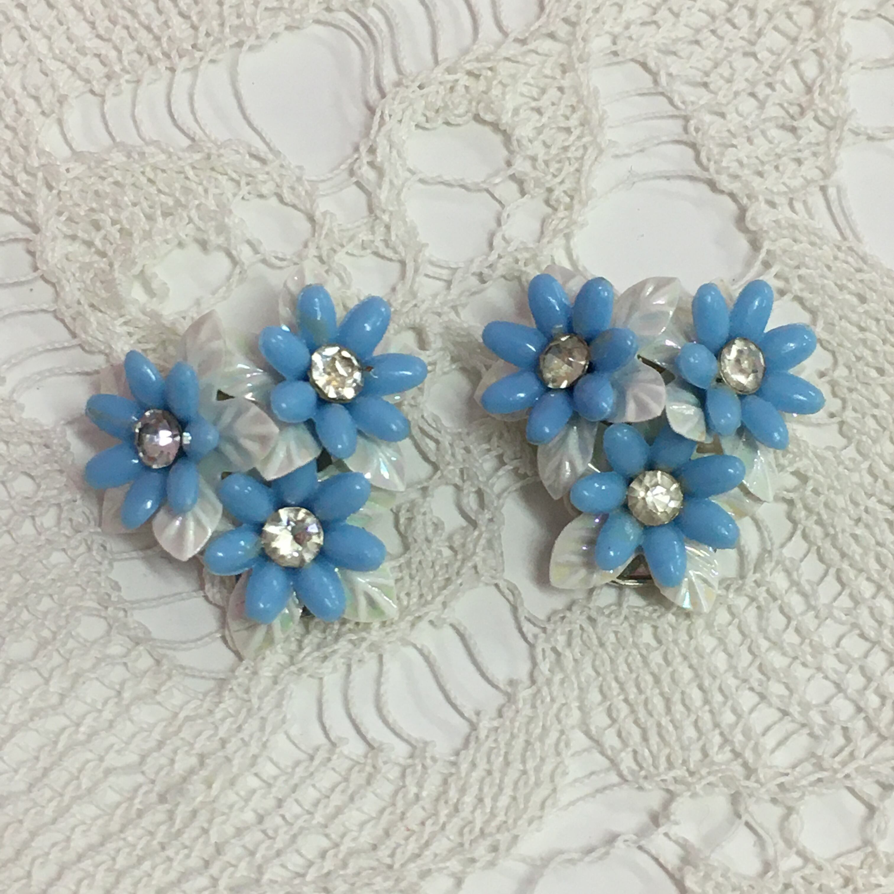 水色の花びらにラインストーンがキラキラととっても可憐なヴィンテージイヤリングです。